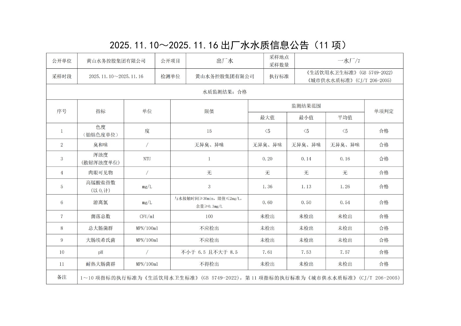 2025.11.10~2025.11.16出厂水水质信息公告(11项)